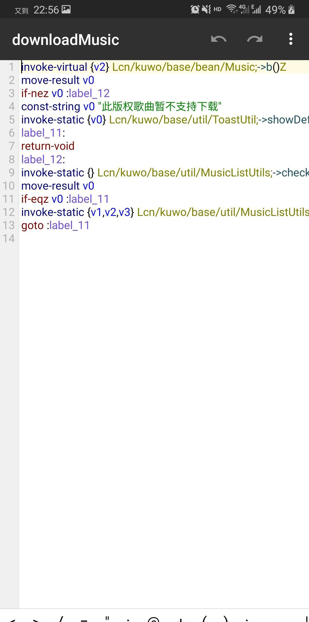 这里面的代码大概意思,if-nez v0 :label_12,意思是说:如果v0≠0就跳到label_12,就是提示不能下载