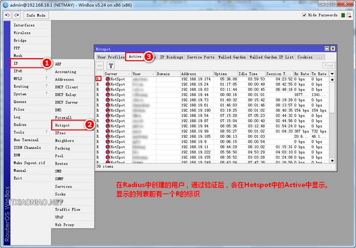 1、可以直接在UserMan中進行查看,也可以使用Winbox查看用戶狀態、連接等信息,如下圖:
